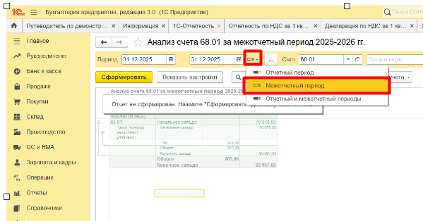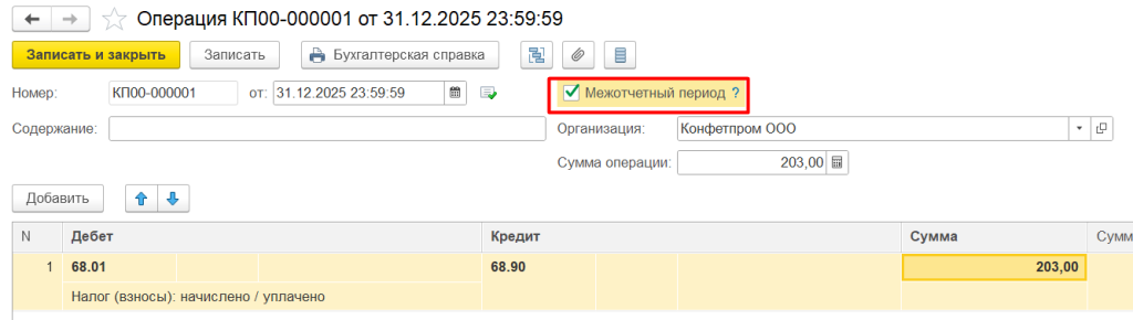 Для того, чтобы сделать такое исправление, надо создать документ "Операция" за 31.12.25 (это важно, потому что возможность включения межотчетного периода появляется только при выборе последнего дня года). В шапке "Операции" ставим "Межотчетный период". Создаем недостающие проводки, которые сформируют правильное сальдо.