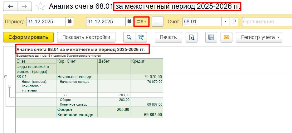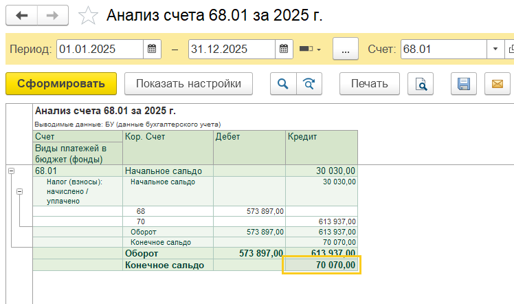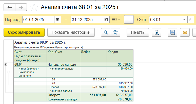Формируем анализ счета за 2025 год, сальдо на конец не изменилось