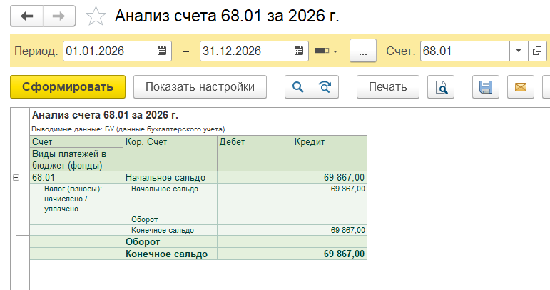 Формируем анализ счета за 2026 год. Начальное сальдо изменилось, теперь оно правильное, но не совпадает с конечным сальдо за 2025 год.
