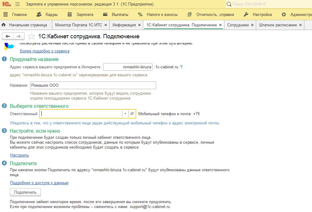 Подключение «1С: Кабинет сотрудника». Начинаем работать в сервисе. Шаги в «Зарплата и управление персоналом, редакция 3.1».