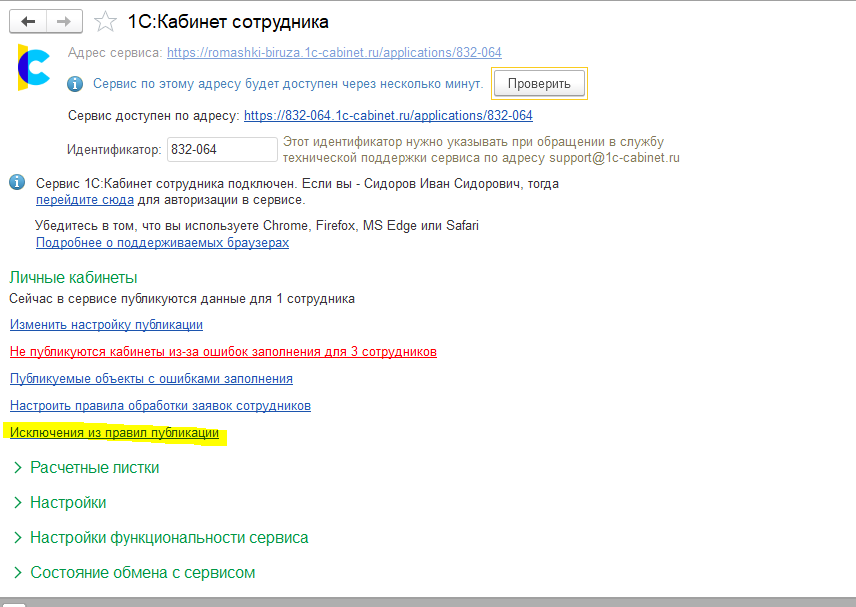 Настройка выгрузки в сервис "1С:Кабинет сотрудника", настройка исключений публикации.