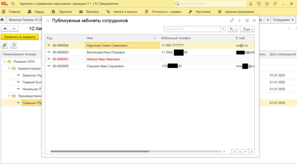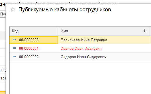 В форме настройки выгрузки можно нажать на кнопку "Публикуемые кабинеты сотрудников" и мы увидем список сотрудников, данные по которым будут выгружаться. Красным выделены сотрудники, у которых не указаны телефон и почта.