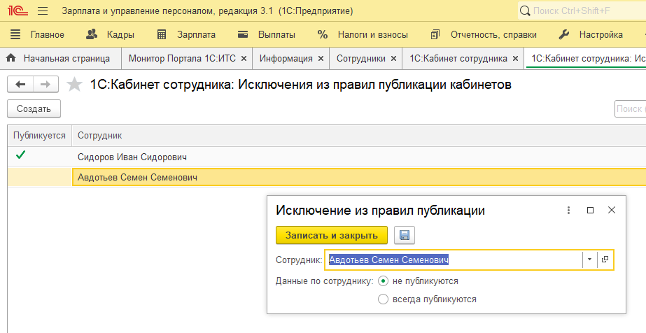 После публикации форма настройки изменилась, и мы можем настроить исключения для публикации, по тем сотрудникам, данные по которым не должны быть опубликованы.